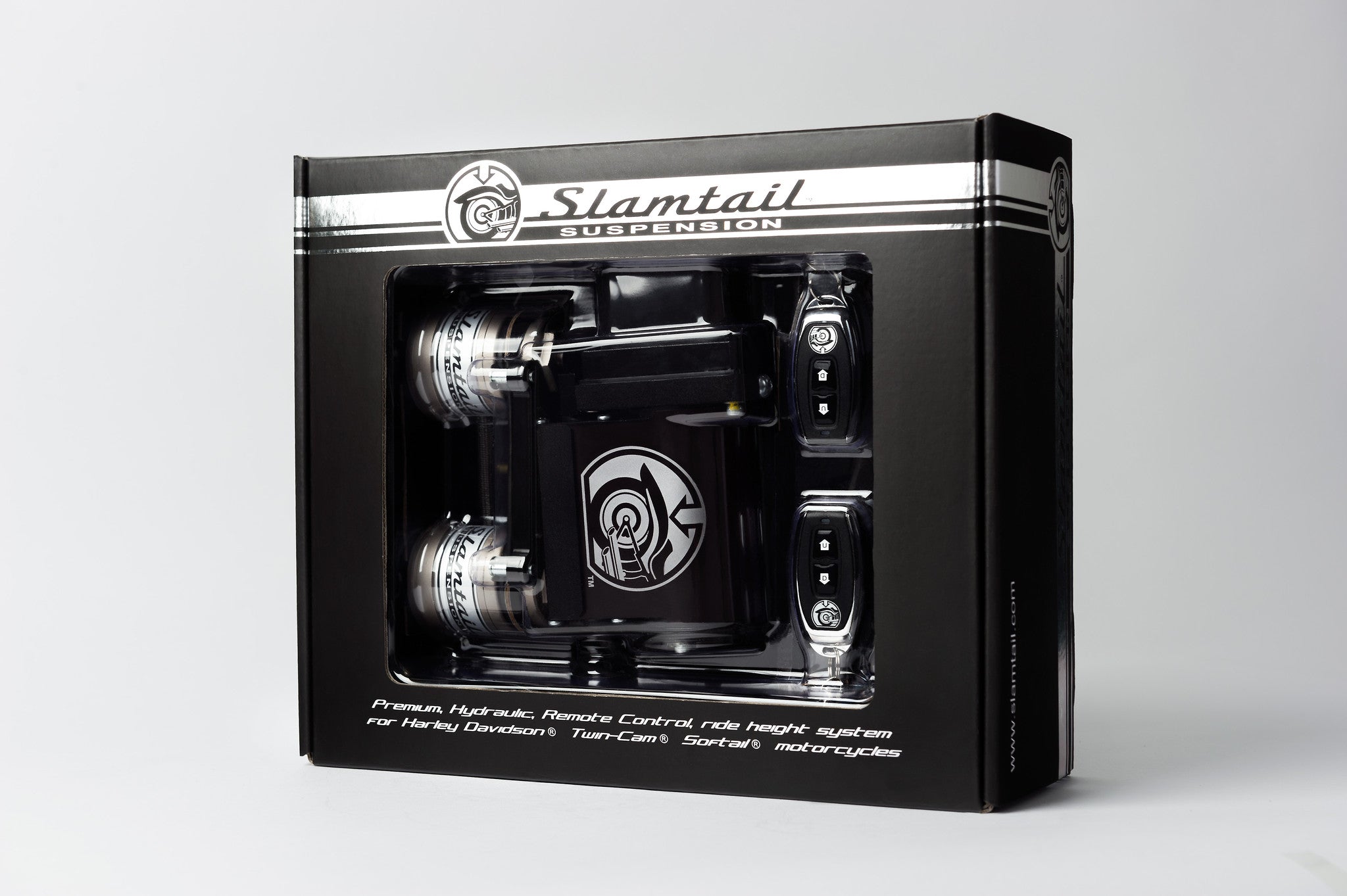 Slamtail is unique because it features remote control key-fob operation, that drives hydraulic rams (not airbags), which attach to your OEM Harley spring/shockers. (Thus adding value, re-using them, not scrap them).